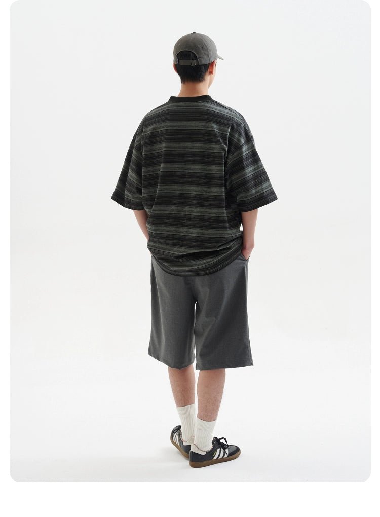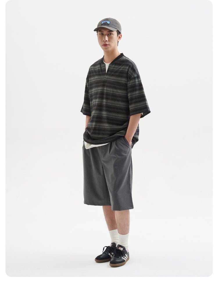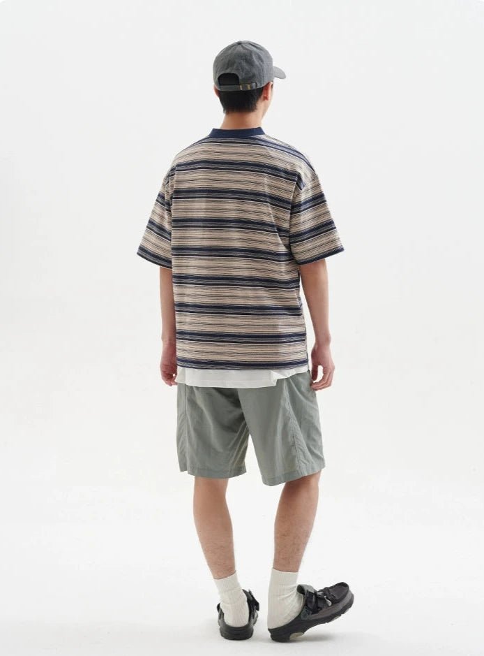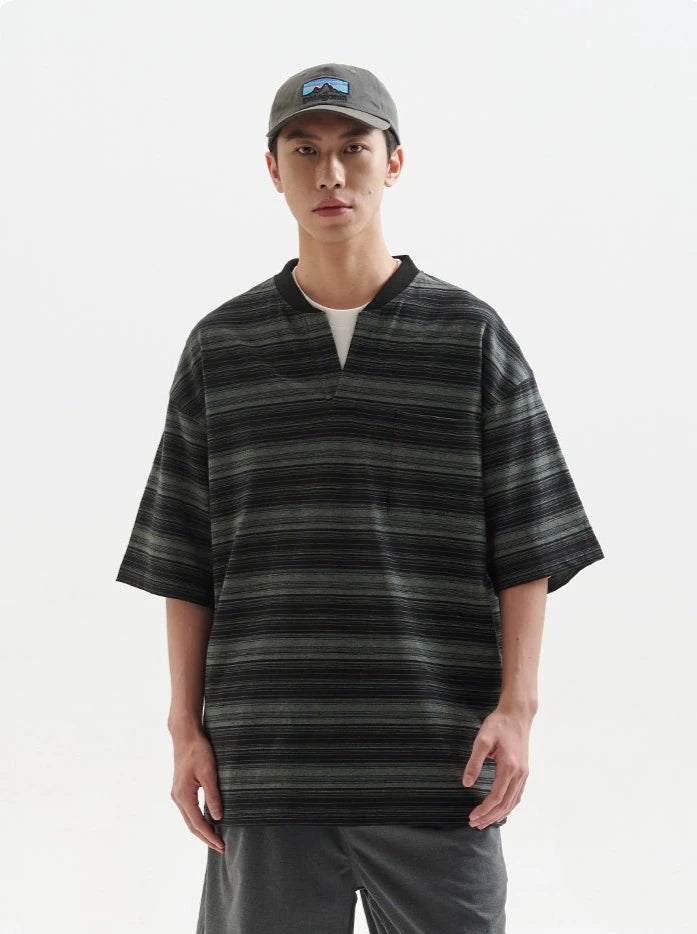 ヘンリーカラーとストライプ柄が絶妙にマッチし、シンプルでありながらも存在感のあるデザインとなっています。オイルペイント風のパターンが、アーティスティックな雰囲気を演出し、周囲の視線を集めること間違いなしです。