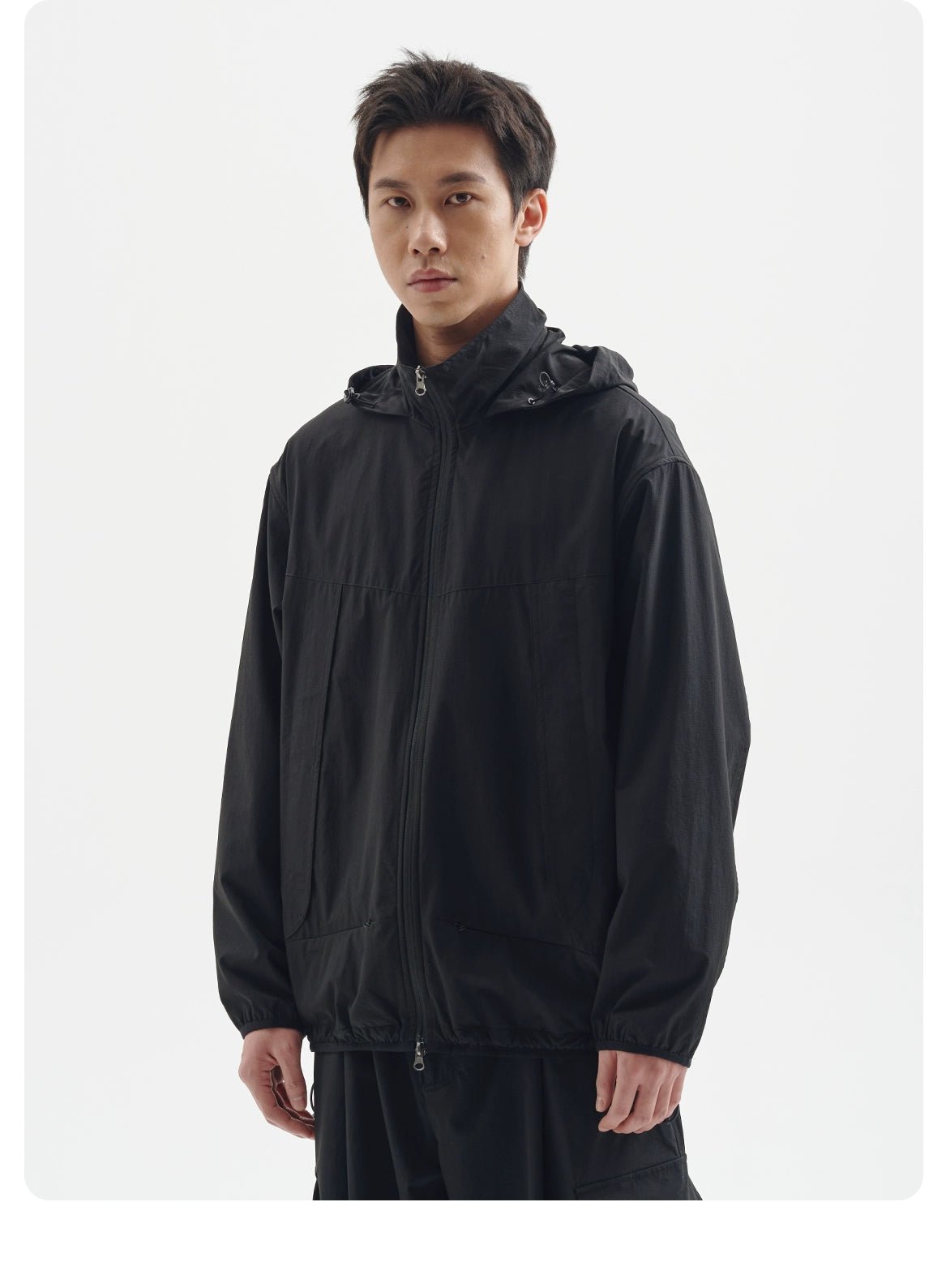 機能性とスタイルを兼ね備えたスタンドカラージャケット。軽量で通気性に優れたメッシュ素材を採用し、春夏のアクティブなシーンに最適。通勤や外出時に便利な隠しフードは、天候の変化にもスマートに対応します。