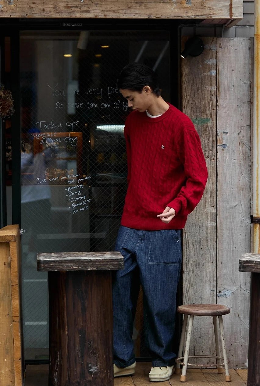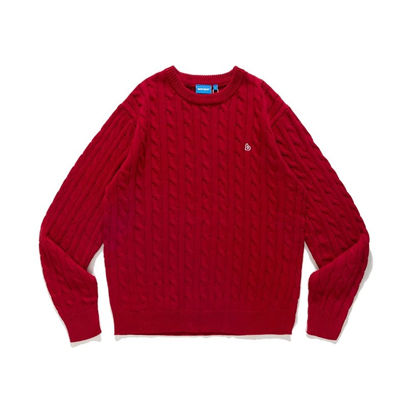 このセーターは、柔らかな赤いツイスト編みが特徴で、シンプルながらも視覚的なアクセントをプラス。素材には高品質のニットを使用し、暖かさと通気性を両立。寒い季節でも心地よい着用感を提供します。